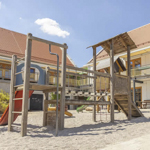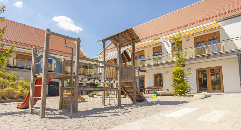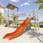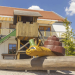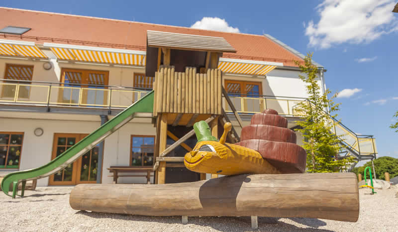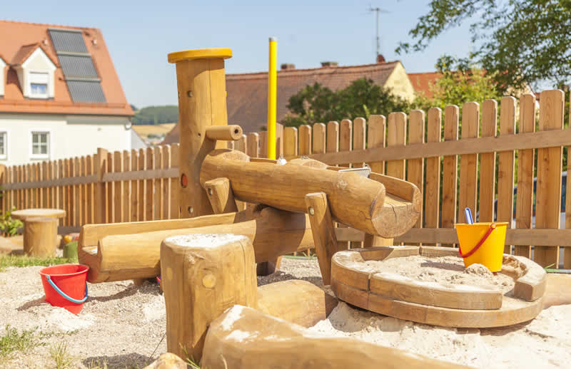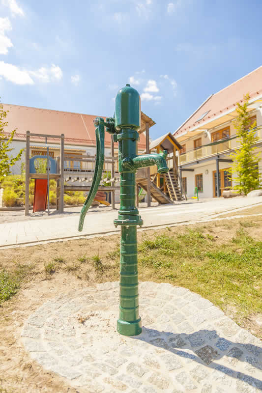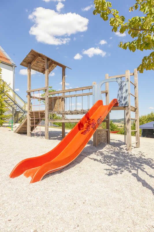 Der Erlebnisspielplatz bietet sich ideal für Entdeckungs- und Wasserspiele an. Zusätzlich befindet sich dort ein Spielhäuschen, zwei Klettertürme, eine Vogelnestschaukel und verschiedene Spielgeräte zur Förderung und Unterstützung der motorischen Fähigkeiten.